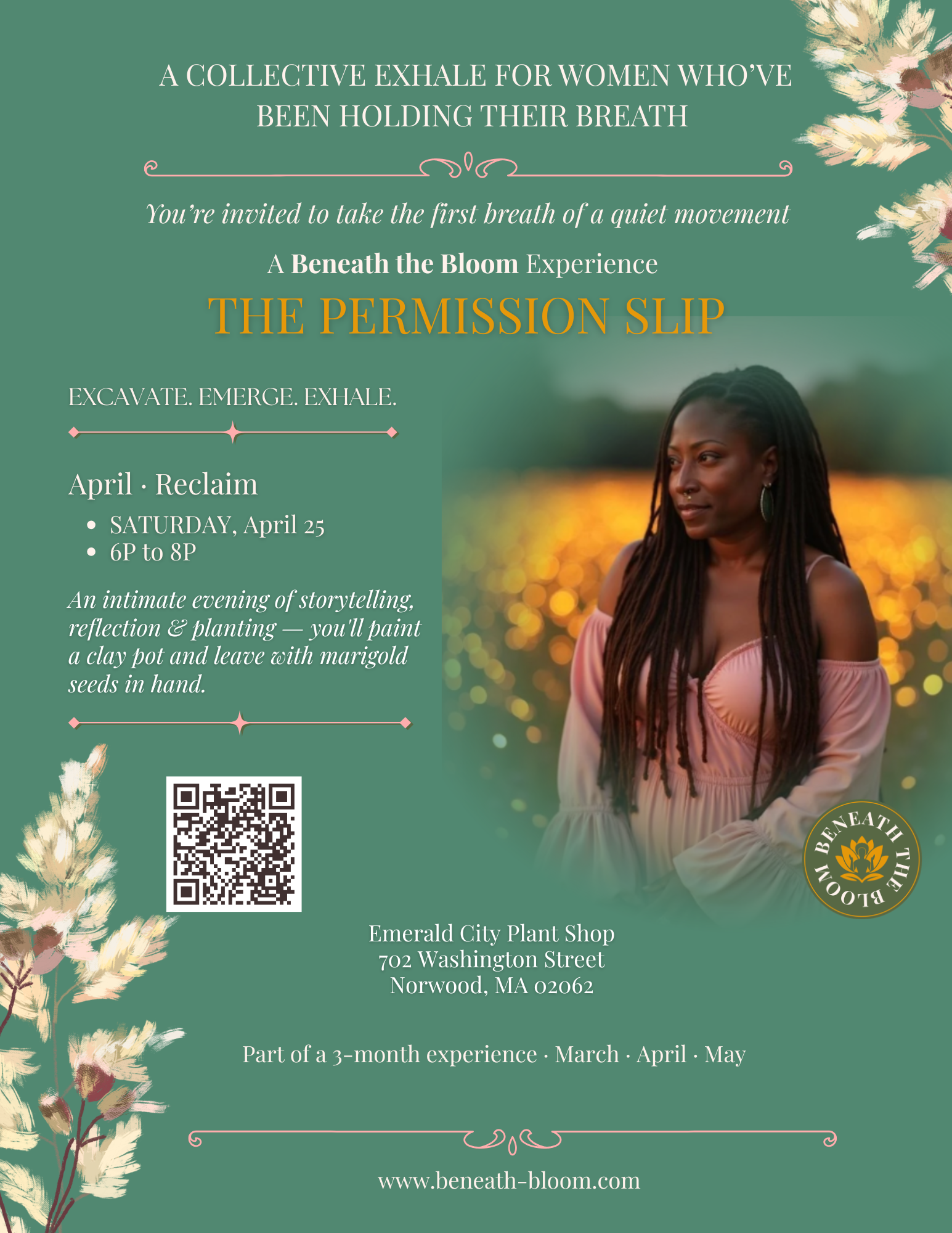 The Permission Slip is a three-part evening series — a gentle unfolding from grounding to planting to blooming. Not a lecture. Not therapy. Not networking. But a room where your nervous system can finally rest. Where your inner child is invited to create. Where you are held without having to perform strength.
